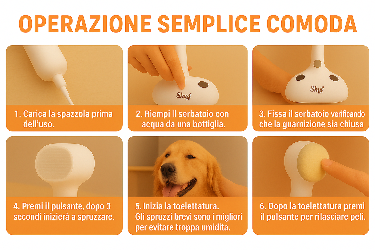 Il pennello produce una nebbia ultrafine e silenziosa, non uno spray sorprendente. Questo aiuta a ridurre l'elettricita statica, che e spesso la vera causa del disagio durante la spazzolatura a secco. La maggior parte degli animali domestici si adatta rapidamente e gode della sensazione rilassante